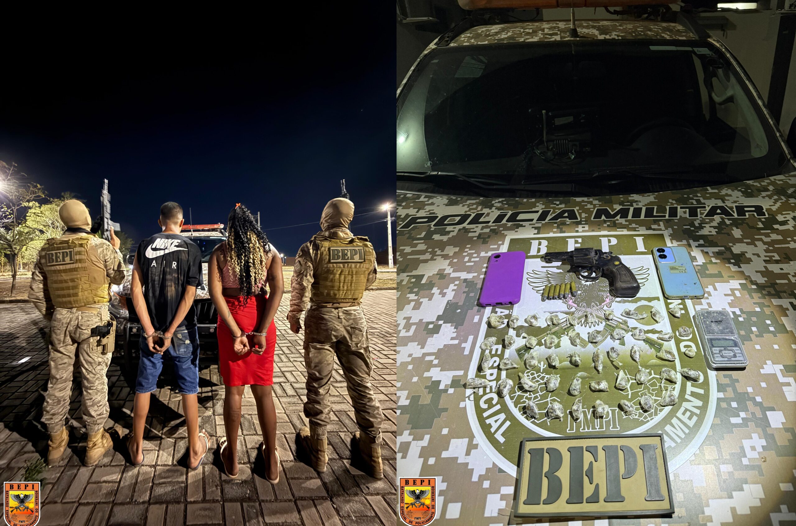 Os suspeitos foram identificados como A.C.A.D., de 20 anos, e M.D.C.V.S.N., de 26 anos. Na ação, os policiais apreenderam um revólver calibre 38, seis munições intactas, 47 porções de substância análoga à maconha e três celulares. Todos foram encaminhados para a Central de Flagrantes de Teresina.