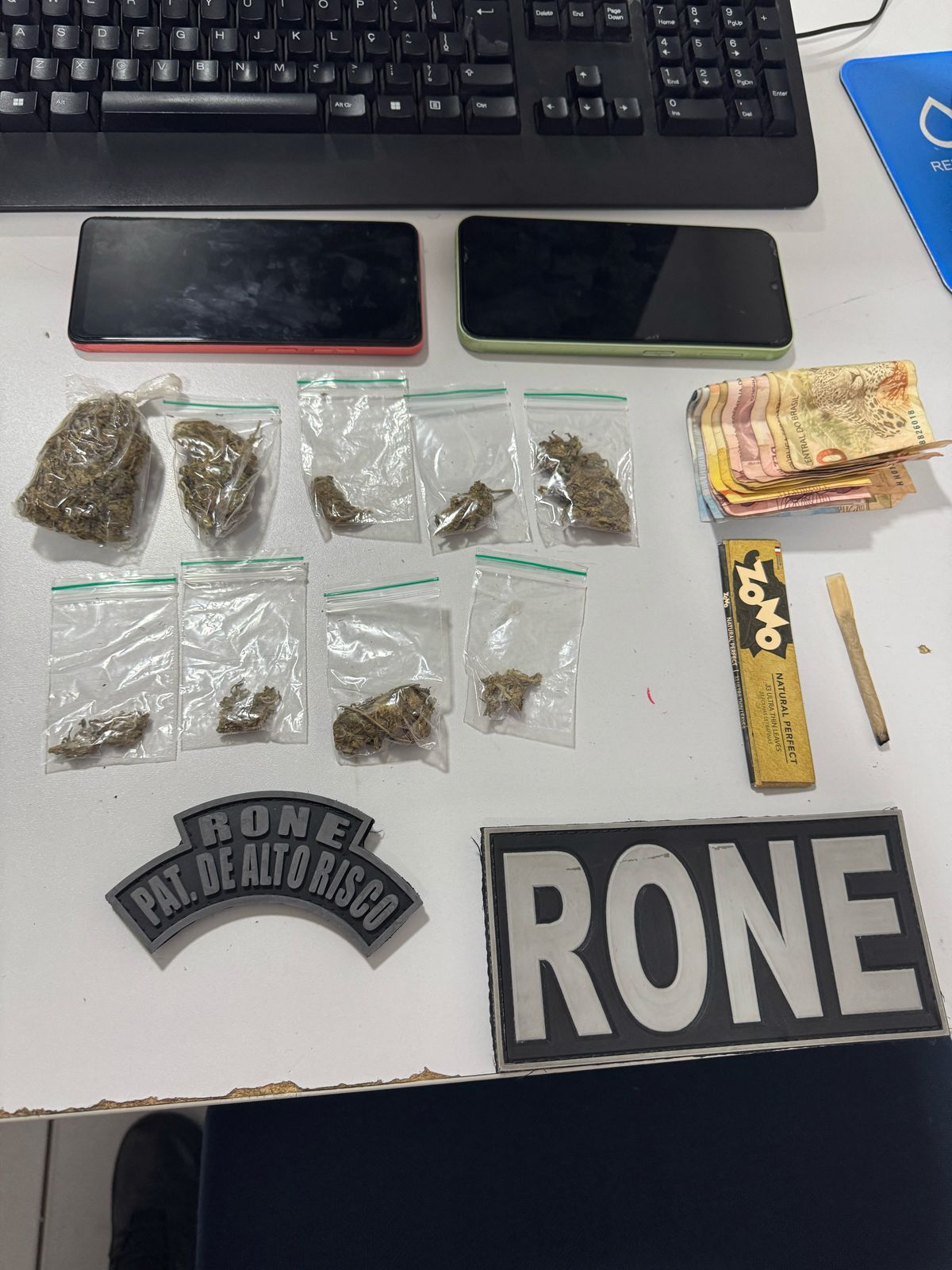 Foram apreendidos oito invólucros de maconha prontos para venda, dois aparelhos celulares e R$ 246,00 em espécie. Os dois homens, identificados pelas iniciais L.P. da S. e I. da S.A., foram conduzidos à Delegacia de Prevenção e Repressão a Entorpecentes (DENARC) e autuados em flagrante com base na Lei de Drogas.