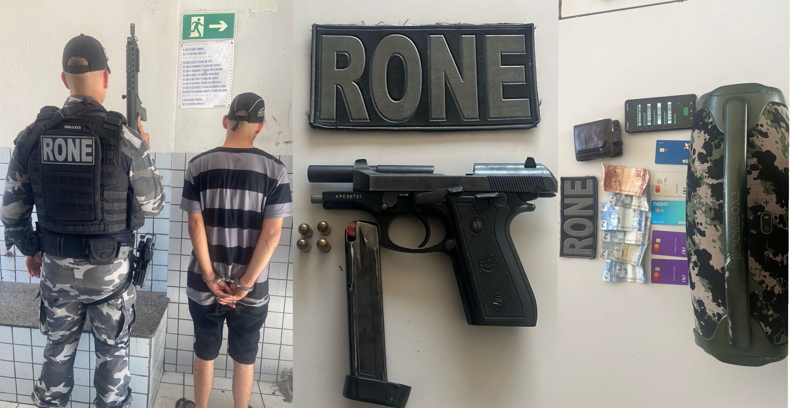 Além da arma, os policiais apreenderam o veículo, um celular Redmi preto, uma caixa de som JBL Boombox 3, uma carteira com cartões diversos e R$ 20 em dinheiro.