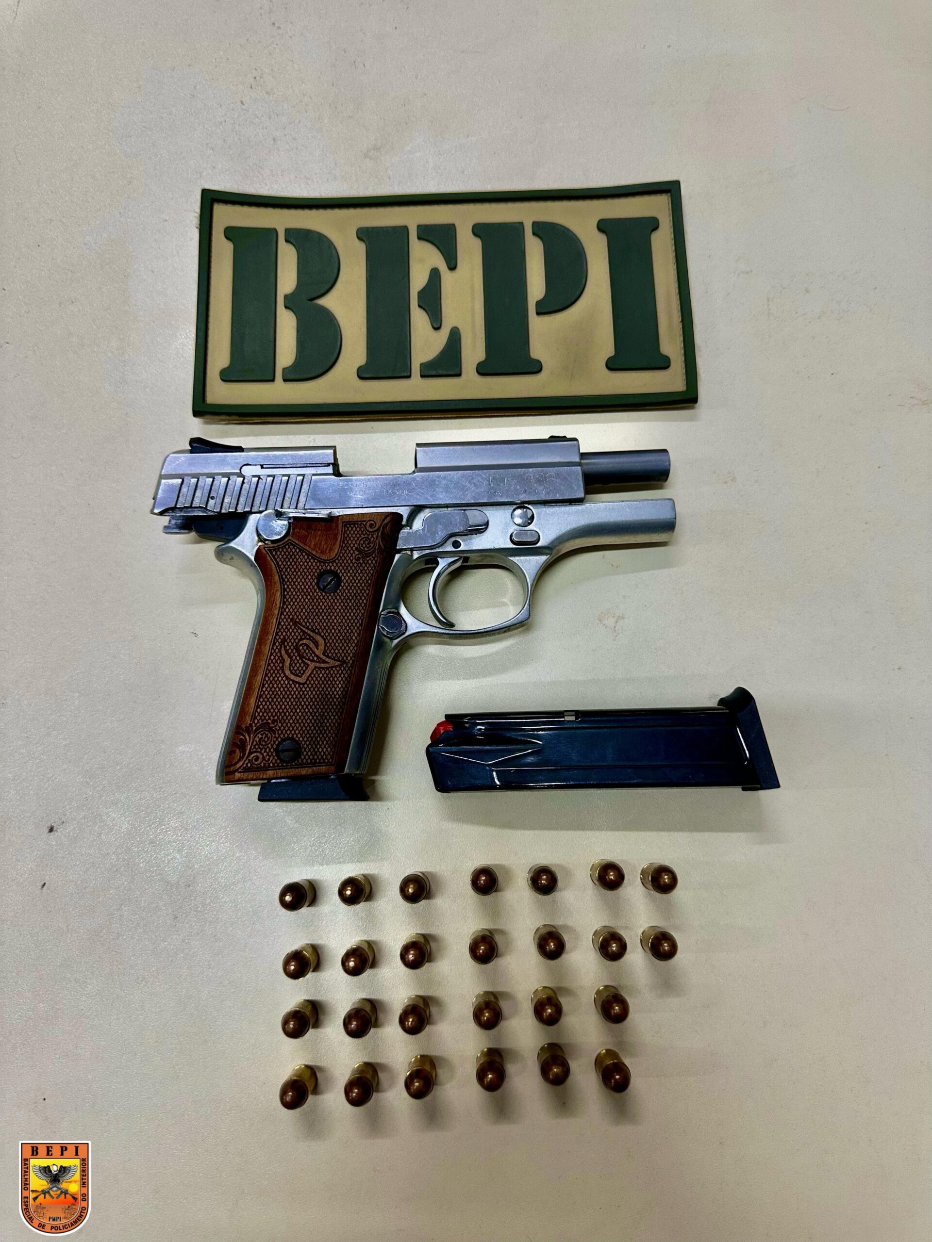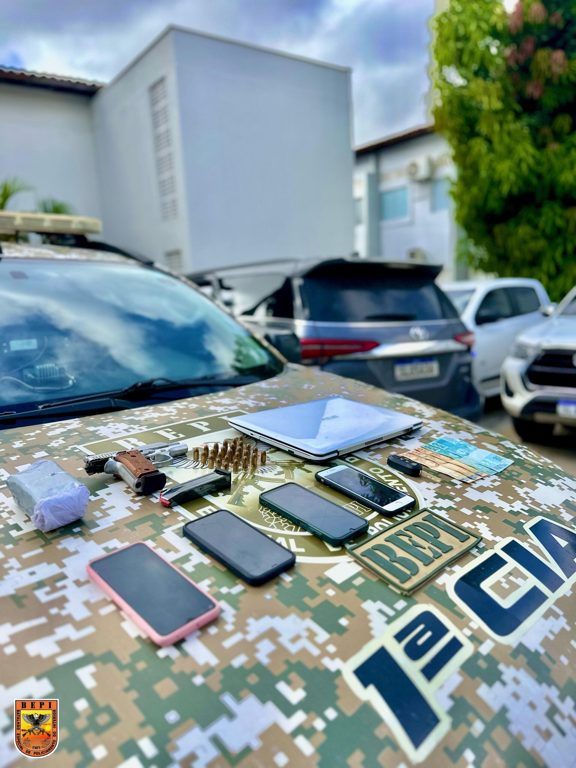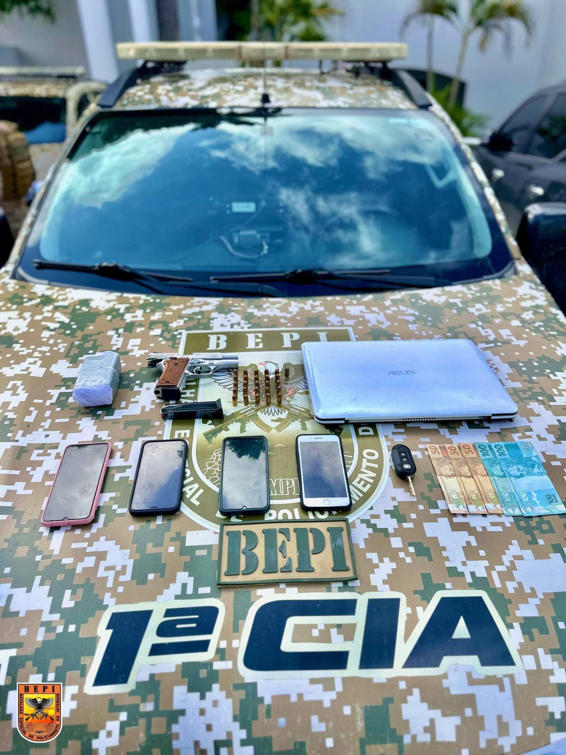 Com os suspeitos, foram apreendidos uma pistola Taurus PT 938, 26 munições, um carregador, quatro aparelhos celulares, R$ 350 em dinheiro, um tablet de substância análoga à maconha e um veículo Fiat Mobi.
