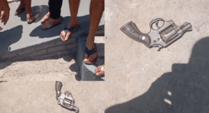 Durante o confronto, o comerciante e os dois suspeitos foram atingidos. Populares encontraram no local uma pistola que, conforme a polícia, pode pertencer a um dos assaltantes.