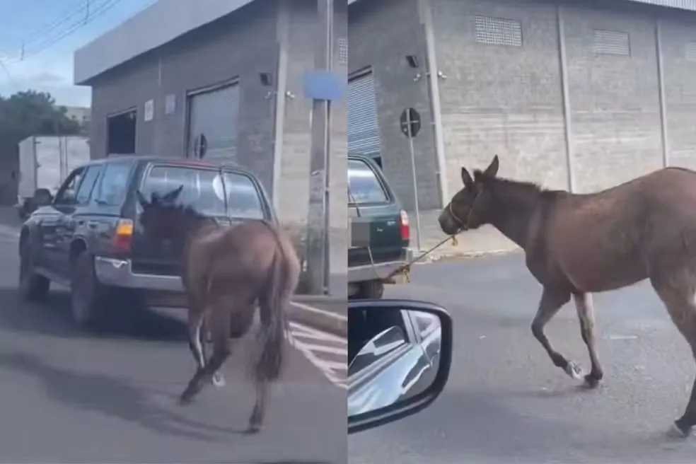 Uma cena chocante de maus-tratos a animal foi registrada na tarde de segunda-feira (23) na Avenida Zequinha Freire, zona Leste de Teresina. Um jumento foi amarrado pela cabeça à traseira de um carro em movimento e forçado a correr por vários metros, numa tentativa de acompanhar a velocidade do veículo.